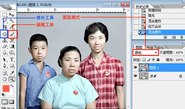 修復和上色我們只需要用到兩個工具,和記住一個模式。分別為上圖左邊藍框標示的修補工具、紅框標示的畫筆工具,右邊紅框標示的顏色模式。