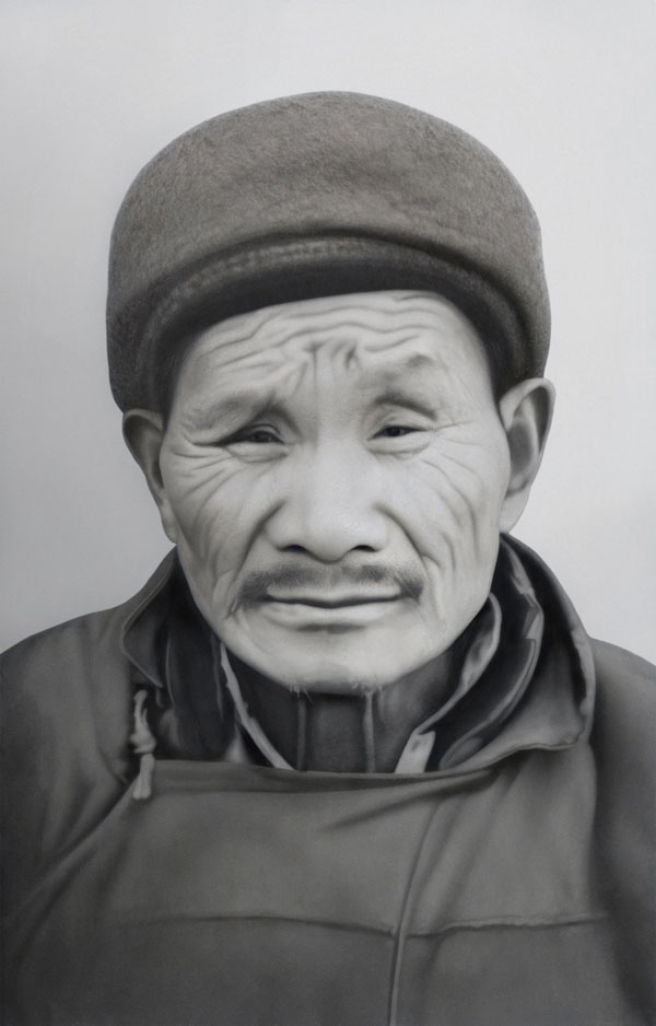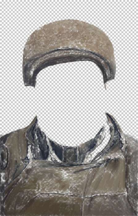這個(gè)是單獨(dú)繪畫的圖層,具體是參考原照片,根據(jù)形狀走向使用畫筆工具畫繪畫覆蓋,上圖為衣服帽子繪畫的截圖。這個(gè)過(guò)程使用畫筆是考慮到畫面的折皺紋理太多,如果使用圖章或者涂抹會(huì)使折皺線條模糊導(dǎo)致清晰度下降,而畫筆可以在精細(xì)的線條上更準(zhǔn)確的表現(xiàn)。