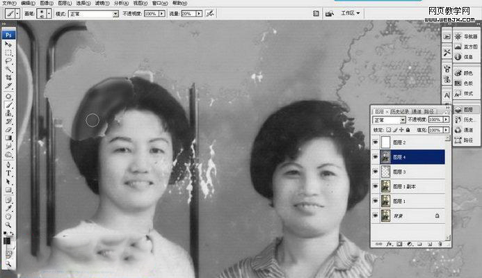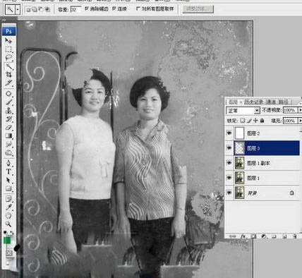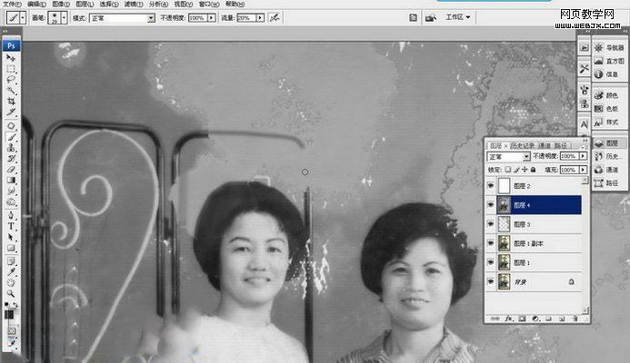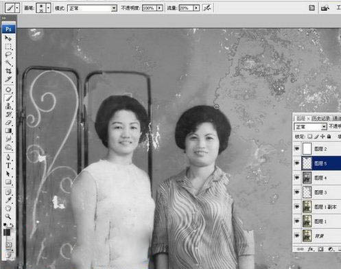 本教程介紹局部掉色反白的照片的修復方法。大致過程:先把照片去色處理,然后把反白的部分選取出來調成跟背景一致的顏色。再用畫筆把殘缺的部分補上去包括人物部分。如果照片中有部分的物品無法修復,可以設法去找類似的物品換掉。