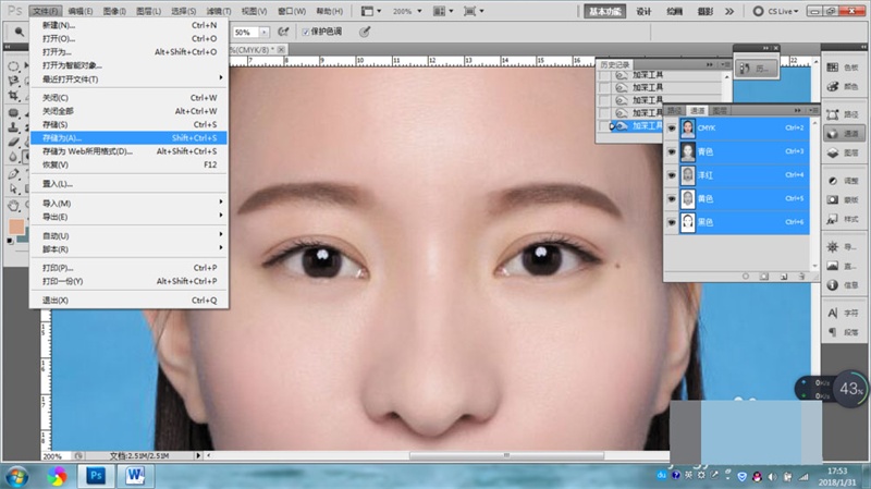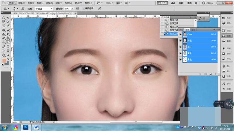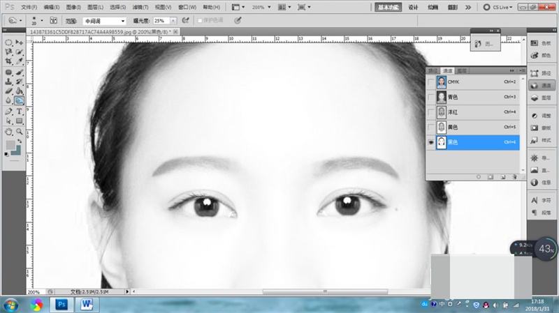 3、單擊CMYK通道,查看上一步加深的情況,如果眉毛顏色加深的不夠,可以回到第二步再次加深。