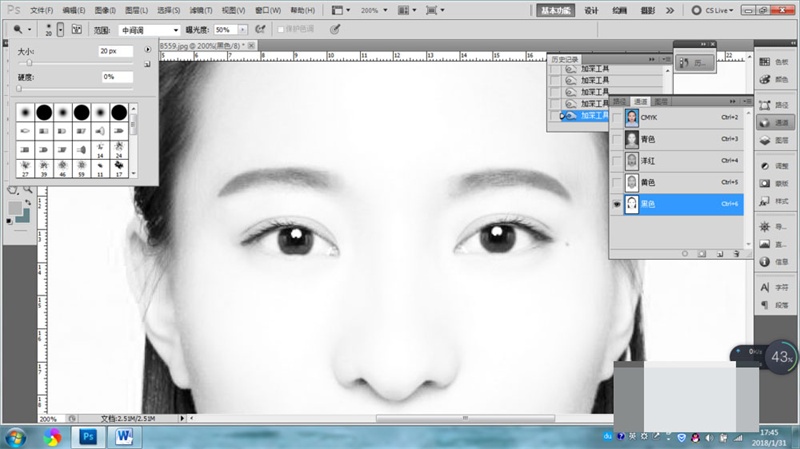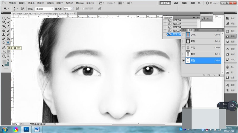 2、打開通道,單擊黑色通道,使用加深工具在眉毛處涂抹,眉毛就會變得更黑。