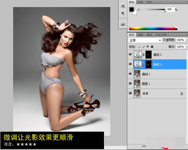 四、但是還有一點,為了讓光影效果更順滑,會做一些微調(diào),照片修復(fù)工具很簡單,曲線就可以了!要注意在調(diào)節(jié)層里打開曲線,并且在蒙板里擦拭所要調(diào)整的范圍。 此圖我只把模特腰間的肉肉略微調(diào)暗,讓膚色與整體效果更貼合。如果一個調(diào)節(jié)層不夠,就多建幾個,調(diào)到最為理想滿意為止。