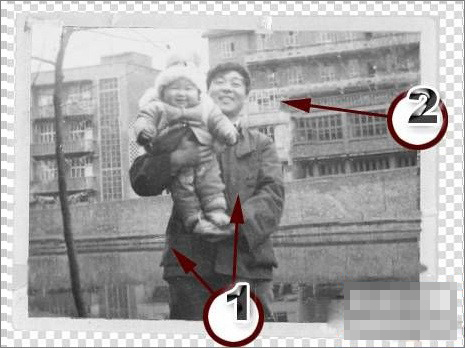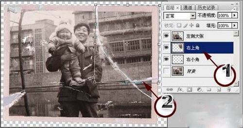 2、在背景圖層前面的眼睛圖標上點擊,將它隱藏,分別進入較小的碎片圖層,按下Ctrl+T,對它們應用自由變換。旋轉角度,使它和最大的那張照片對齊。破損的照片的掃描稿往往不用再縮放,關鍵要對好位置和角度。而位置和角度最簡單的參考點就是照片的邊緣線與照片中的建筑物等,把它們對齊后將角度旋轉到一致即可。圖2中的標注1所示為當前修復的圖層-右上角的小塊照片。標注2所示為變換框。可以看到照片的邊角已經與左側最大的碎片對齊了。