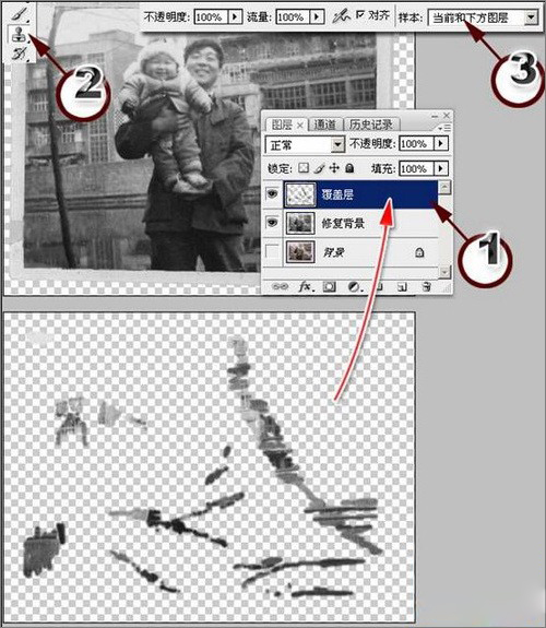 4、按著Alt鍵,在周圍取樣,松開Alt鍵,在破損的地方涂抹。就可以把周圍的取樣圖像覆蓋在破損位置。修復后的圖像如圖3所示,圖3下方為覆蓋層中我們修復的圖像部分,可以看到重點修復點是在破損位置。