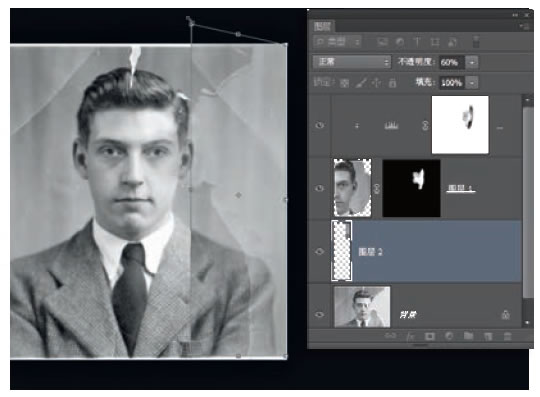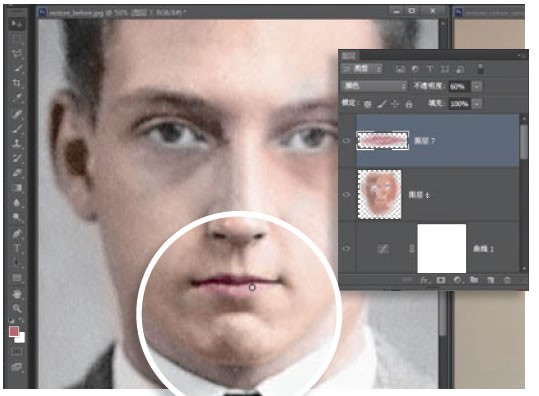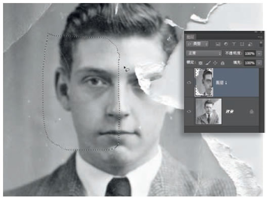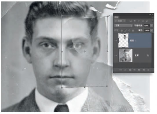 啟動Photoshop,打開這張斑駁老照片的電子版文件,從工具欄中選擇套索工具,如上圖所示勾選人物的左側面孔,使用快捷鍵Ctrl+J將選區復制為新圖層。執行“窗口>圖層”命令打開圖層面板,將上方圖層的不透明度降至65%。
