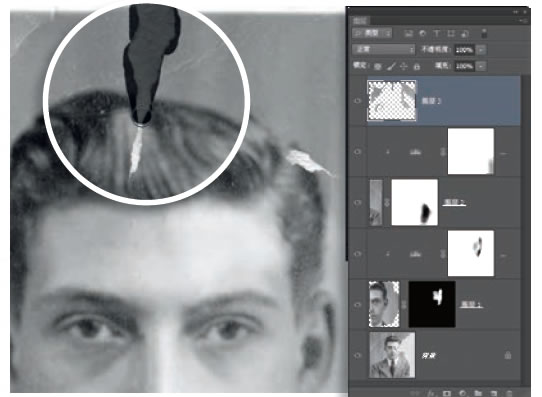 在圖層面板中選中“圖層 1”的蒙版,使用白色畫筆在蒙版上涂抹,還原被黑色蒙版遮蓋住的面部部分。如果繪制出錯,可以使用快捷鍵X交換前景色與背景色,用黑色畫筆遮蓋出錯的部分。