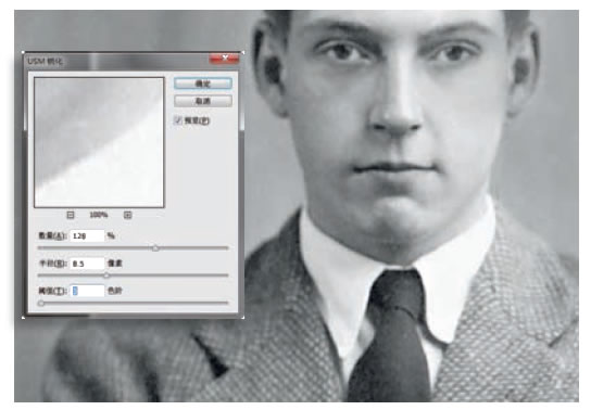 執行“濾鏡>銳化>USM銳化”命令,選擇的設置值為數量128、半徑8.5、閾值3。單擊確定應用濾鏡。執行“濾鏡>雜色>添加雜色”命令,將數量設置為6,分布設置為平均,勾選單色選項,單擊確定按鈕。