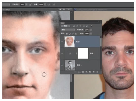 選擇色階調整圖層的圖層蒙版,再選擇畫筆工具。依次使用快捷鍵D、X將前景色設置為黑色,再使用快捷鍵3將畫筆不透明度設置為30%。在色階圖層的蒙版上涂抹,還原眼窩、眼袋等的陰影部分??筛鶕枰{整畫筆大小。