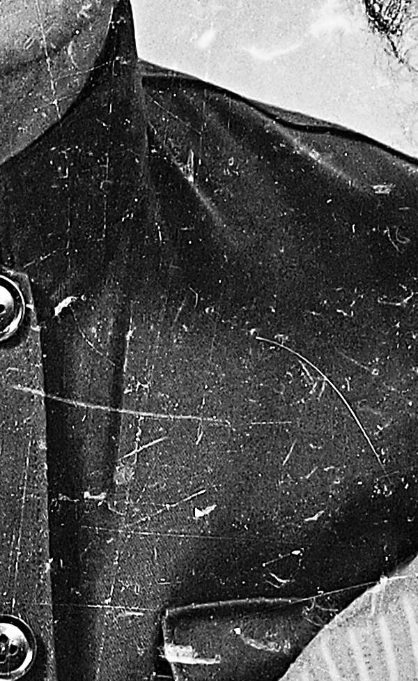 調(diào)整裁剪完成,得到正常的電子版照片。初步看,這種照片沒有明顯的破損,肉眼可見幾處底片脫膜白斑。從顧客的角度看,這種照片修復(fù)很簡(jiǎn)單,思路也簡(jiǎn)單,手工去掉幾處明顯的斑點(diǎn),執(zhí)行強(qiáng)力降噪就可以得到干凈完整的照片,這個(gè)想法也沒錯(cuò),但得看用途和輸出要求,下面會(huì)分解。那從專業(yè)修復(fù)師角度又該以什么樣的方式評(píng)估修復(fù)呢,看下面: