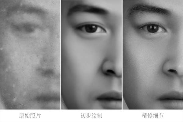 從左至右分別是原始照片、初步繪制、完成效果。通過對比,可以看到修復(fù)過程的明顯變化,單獨(dú)放大看下面:
